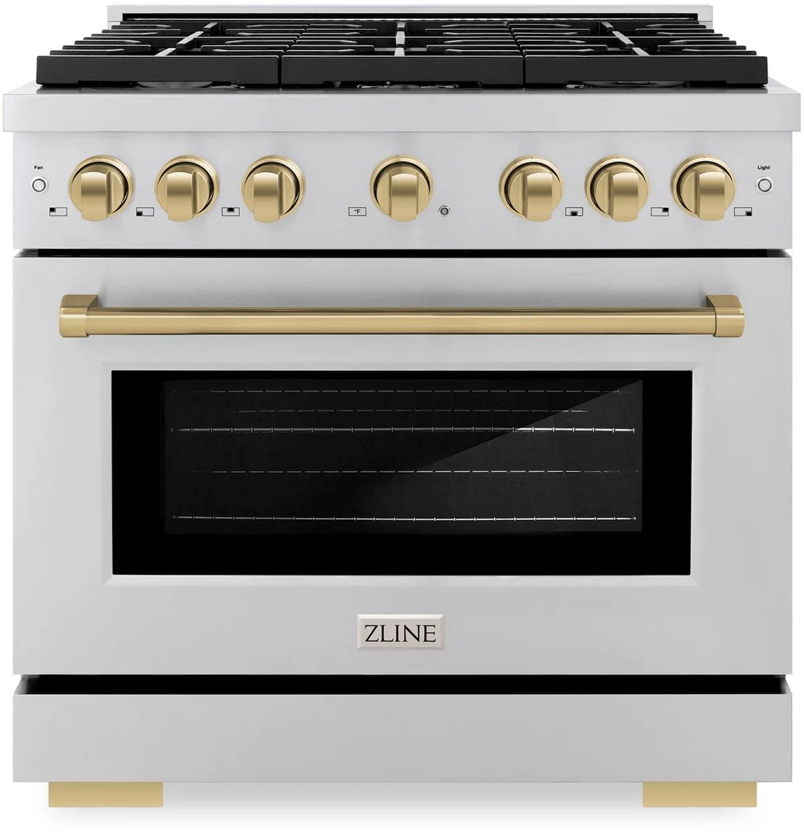 The ZLINE Autograph Edition 36 in. 5.2 cu. ft. Paramount Dual Fuel Range with 6 Burner Gas Cooktop and Electric Convection Oven in Stainless Steel with Champagne Bronze Accents (SDRZ-36-CB) combines the versatility of a gas cooktop with 6 Italian-made auto-reignition burners, an electric convection oven with digital thermostat technology, enhanced cast iron grates, a Horizon oven door window design, and elegant champagne bronze knobs and handle allowing you to master every meal.