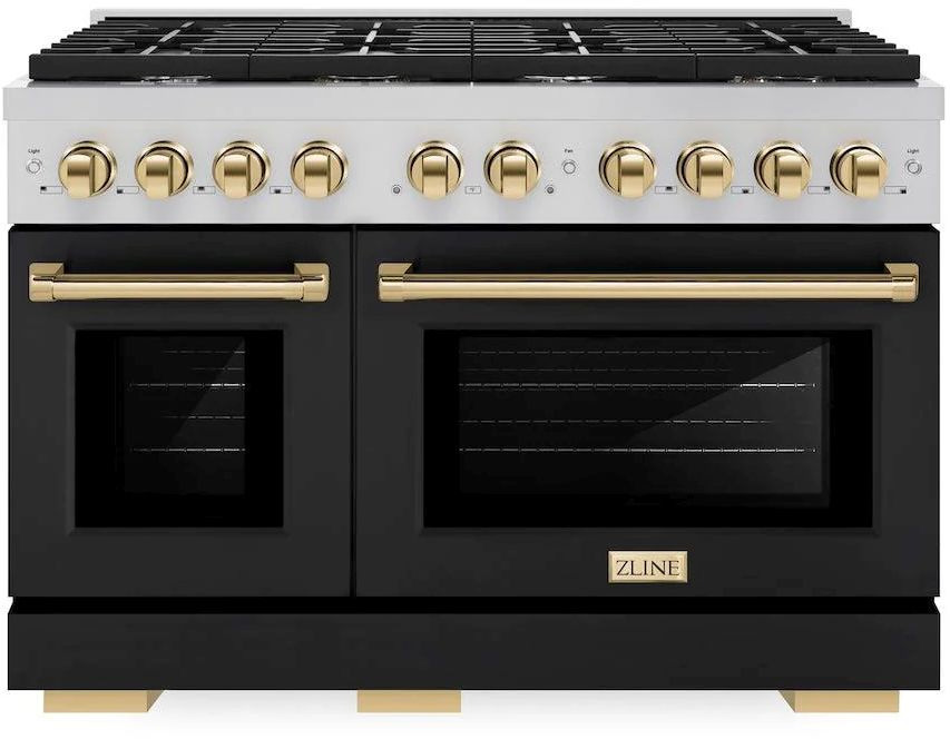 The ZLINE Autograph Edition 48 in. 6.7 cu. ft. Paramount Double Oven Gas Range with 8 Burner Cooktop in Stainless Steel with Black Matte Doors and Polished Gold Accents (SGRZ-BLM-48-G) features a versatile gas cooktop with 8 Italian-made auto-reignition burners, a large high-performing gas convection oven, a small baking oven, enhanced cast iron grates, beautiful black matte doors with Horizon window designs, and elegant polished gold knobs and handles allowing you to master every meal.